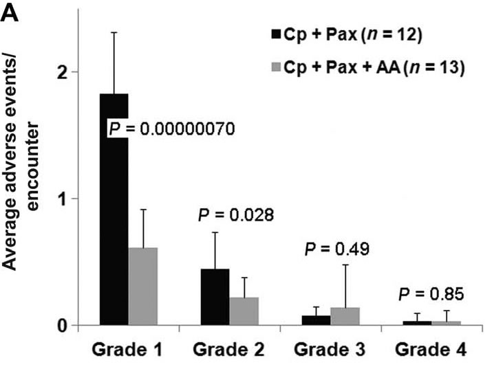 So what we have here is a small clinical trial with a 19% dropout rate that wasn’t even blinded. It reported zero difference in overall survival (both were, as one would expect for ovarian cancer at this stage, abysmal), and zero statistically significant difference in time to relapse/progression. In all fairness, there would have had to have been an enormous effect to produce a statistically significant effect on survival or progression in such a small study, but these are the two “hard” endpoints that would be least affected by the lack of blinding, although one notes that time to progression could be affected by lack of blinding when the definition depends on interpreting scans. It’s also hard not to note that the differences in toxicities are all in the mildest reported toxicities, grades 1 and 2 (out of a scale of 1 to 5, with a score of 1, which denotes mild toxicity that requires no intervention to 5, which is death). There were no statistically significant (or even close to statistically significant) differences in toxicities graded 3 or 4, which are the most troubling kind. Take a look at the graph:
