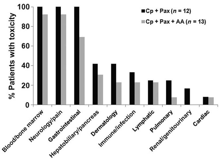Two subjects voluntarily withdrew from the Cp + Pax arm before treatment commenced because they wanted intravenous vitamin C, and they were excluded from data analysis. Two subjects were removed from the Cp + Pax + AA arm because they were noncompliant with tobacco use, and one was removed from the Cp + Pax + AA arm after in vitro cytotoxic assays detected that her tumor cells were resistant to all chemotherapy. These three subjects received doses of chemotherapy and ascorbate, so their adverse events were counted, but they were excluded from the survival report (table S3). Double blinding was used at enrollment and randomization, but was not maintained during the treatment because no placebo control was used.