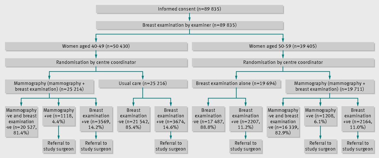 In 1980 a randomised controlled trial of screening mammography and physical examination of breasts in 89,835 women, aged 40 to 59, was initiated in Canada, the Canadian National Breast Screening Study.4 5 6 7 It was designed to tackle research questions that arose from a review of mammography screening in Canada8 and the report by the working group to review the US Breast Cancer Detection and Demonstration projects.9 At that time the only breast screening trial that had reported results was that conducted within the Health Insurance Plan of Greater New York.10 11 Benefit from combined mammography and breast physical examination screening was found in women aged 50-64, but not in women aged 40-49. Therefore the Canadian National Breast Screening Study was designed to evaluate the benefit of screening women aged 40-49 compared with usual care and the risk benefit of adding mammography to breast physical examination in women aged 50-59. It was not deemed ethical to include a no screening arm for women aged 50-59.