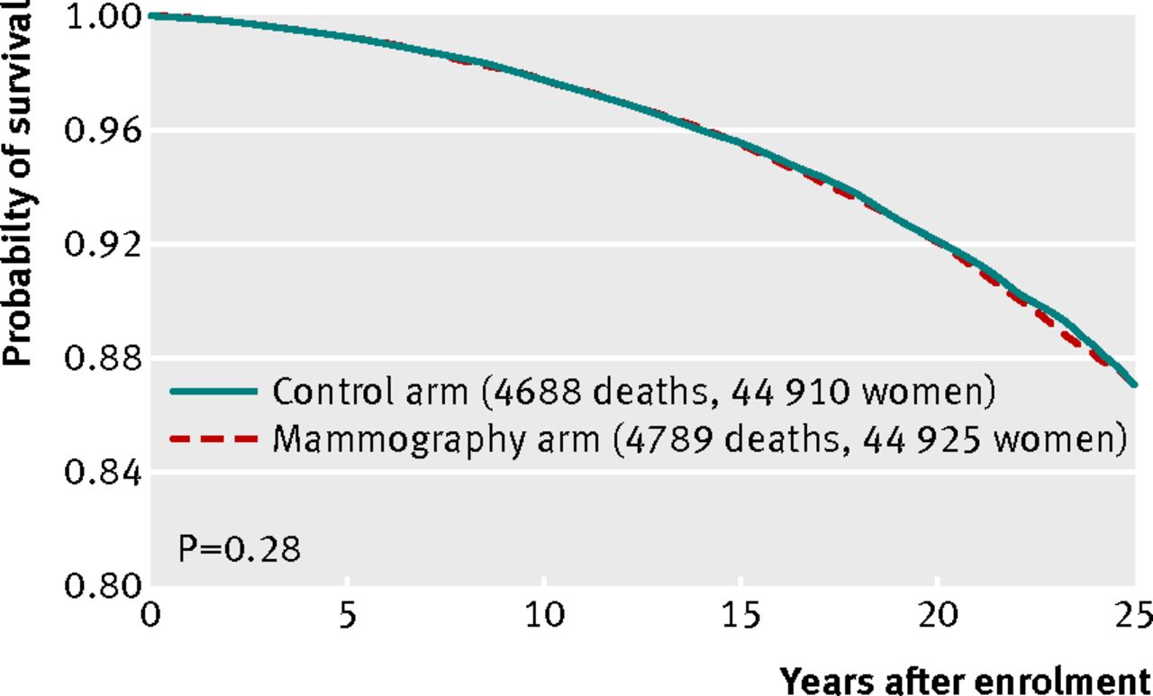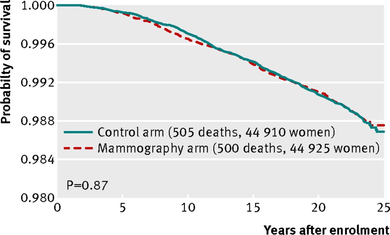 We believe that the lack of an impact of mammography screening on mortality from breast cancer in this study cannot be explained by design issues, lack of statistical power, or poor quality mammography. It has been suggested that women with a positive physical examination before randomisation were preferentially assigned to the mammography arm.12 13 If this were so, the bias would only impact on the results from breast cancers diagnosed during the first round of screening (women retained their group assignment throughout the study). However, after excluding the prevalent breast cancers from the mortality analysis, the data do not support a benefit for mammography screening (hazard ratio 0.90, 95% confidence interval 0.69 to 1.16).