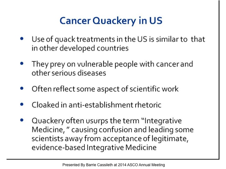 In any case, this same insistence that integrative medicine is evidence-based, in contrast to all that other cancer quackery, bubbled up again near the end of Dr. Cassileth’s talk in the form of a series of slides, one of which can be seen here, in which Dr. Cassileth, to her credit, emphasizes that alternative medicine is mostly quackery. In the accompanying article on the ASCO website, Cassileth says: