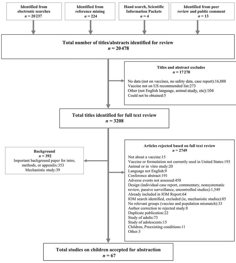 As presented in Fig 1, 20,478 titles were identified through electronic literature searches; review of product inserts; review of Food and Drug Administration, Advisory Committee on Immunization Practices, and other Web sites; reference mining; and requests for Scientific Information Packets from drug manufacturers. Of those, 17 270 were excluded on review of abstract or title for reasons such as “not about a vaccine,” “vaccine not within the scope of this project” (formulations never available in the United States, recommended only for travel), or because they were animal studies. Upon full text review of the remaining 3208 articles, 392 were identified as relevant background/theoretical materials and set aside as potential references for the Introduction; 2749 other articles were excluded. The most common reason for exclusion was lack of suitable study design (1549): individual case reports, nonsystematic reviews, and studies using passive surveillance were excluded. Many publications (458) discussed vaccines on the recommended schedule but did not report or assess AEs. Eighty-eight studies on adults or adolescents were excluded for this article, as were 11 studies of children with preexisting conditions such as HIV, juvenile arthritis, or cancer, which left 67 studies. These studies are in addition to those included in the 2011 IOM consensus report Adverse Effects of Vaccines: Evidence and Causality, which were not abstracted.