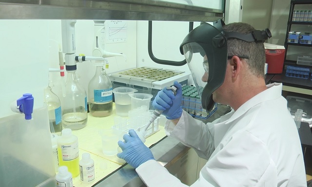 What toxins is Mikey messing around with in the photo, that he needs to wear a full face shield?
