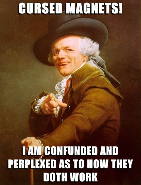 Magnets. They worketh better than thy grammar. “Doth” is singular, thou ninny. And what, prithee, is “confund”?