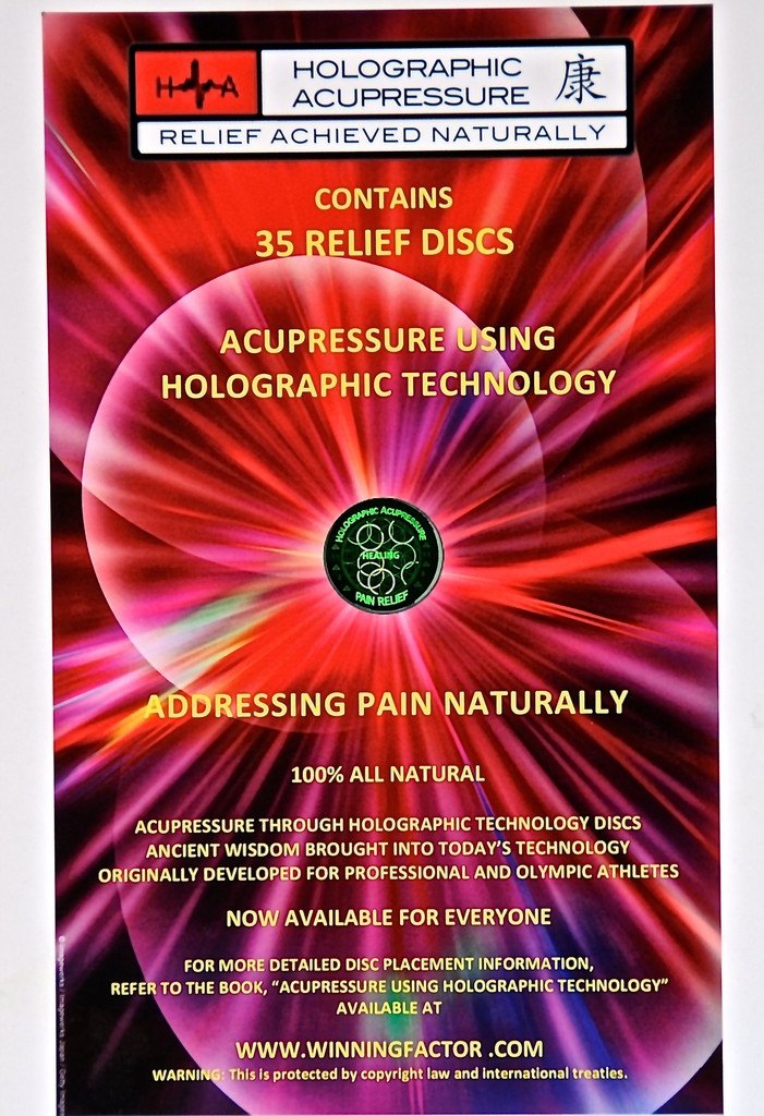 The Holographic Acupressure Discs™ formulated by Winning Factor are a form of acupressure through holographic technology. They are a non-invasive, do-it-yourself and affordable pain relief option for general wellness. They specifically target any areas that acupressure can, such as: back, head, jaw/TMJ, knee, shoulder and wrist pain, sprains and swelling.