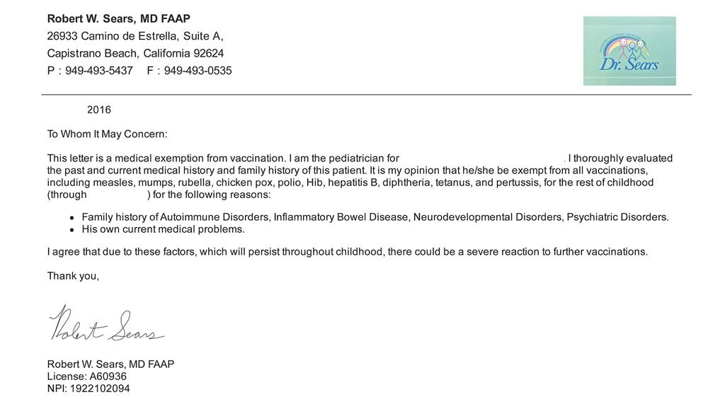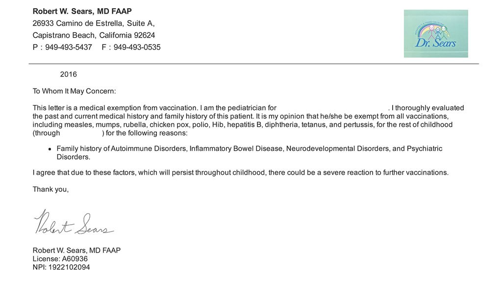 The child’s own pediatrician who supervised administering previous vaccines would be most familiar with their medical history and would not need to wait a year to obtain their medical records to justify an exemption. But Dr Sears is not the physician for people applying for exemptions online.